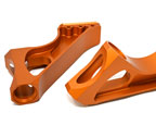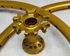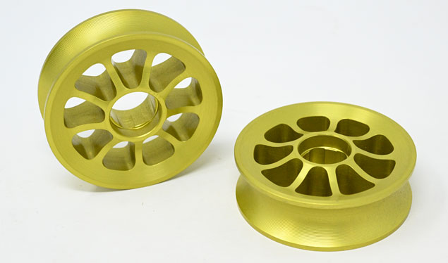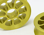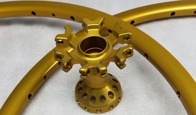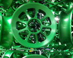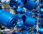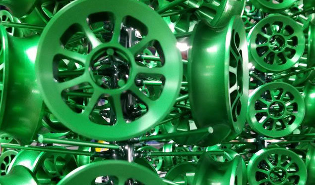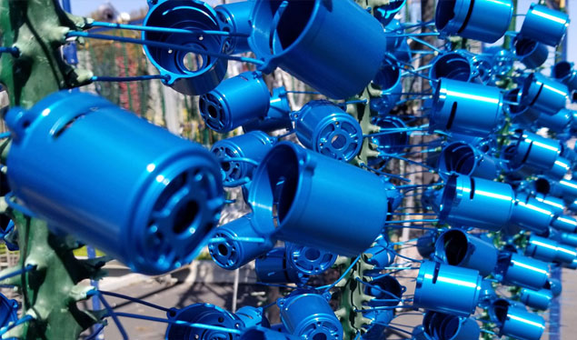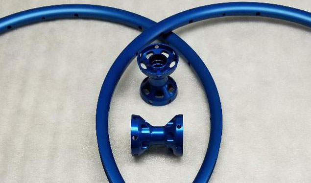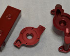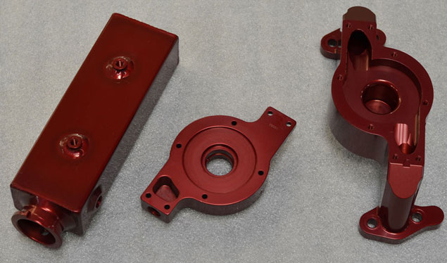 Anodizing is an electrochemical conversion process that forms an oxide film, usually on aluminum, in an electrolyte (chemical solution). The aluminum parts are the anode (thus the term “anodizing”) and current is passed between them and a cathode, usually flat aluminum bars, through the above mentioned electrolyte (sulfuric acid is most commonly used). There are different types of anodize, most commonly referred to as *Type I-Chromic Acid Anodize, Type II-Sulfuric Acid Anodize, and Type III Hard Anodize or Hardcoat from the Mil-A-8625 designation. Other less common types are phosphoric acid and titanium anodize. The anodize is a porous structure that grows out of the base aluminum and absorbs colored dye very well. This is done through a secondary operation with either an organic or inorganic coloring. Elite Metal Finishing processes black, blue, red, gold, grey, blue grey, yellow, green, desert sand and purple colored anodize. Custom colors on request.