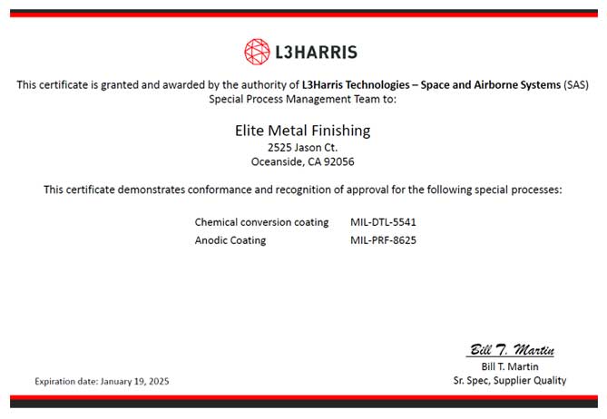 Elite Metal Finishing is located at 2525 Jason Court, Oceanside, CA 92056 and offers Anodize Type II and III, Electroless Nickel, Chem Film, Passivation, Dry Film Lube, Powder Coating, Multi Process and Laser Marking.